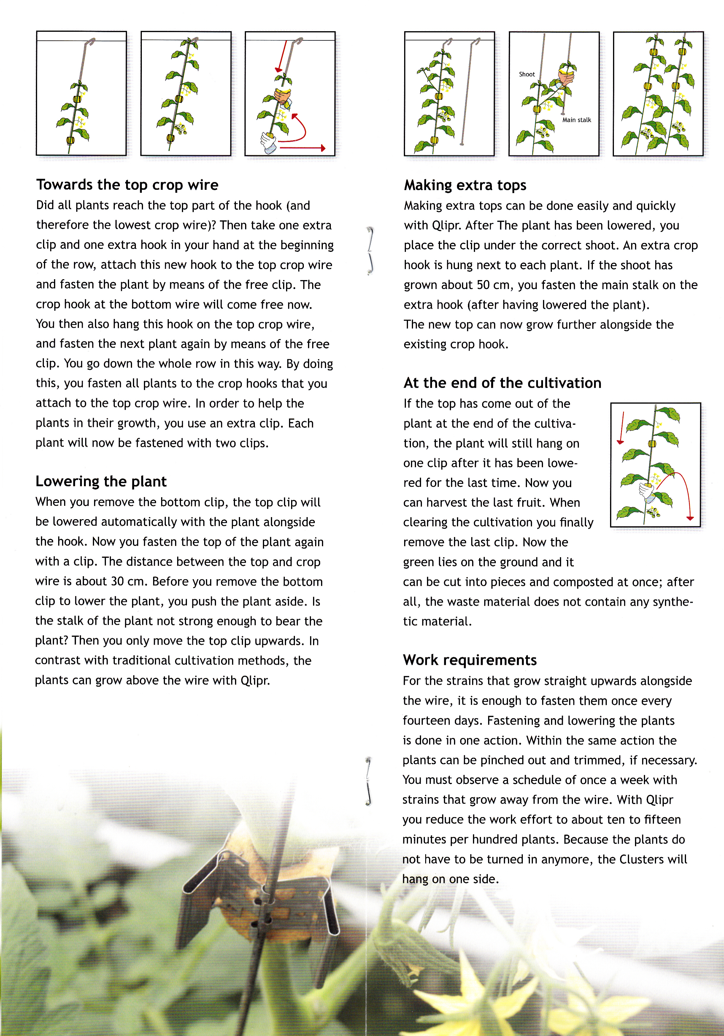 Did all plants reach the top past of the hook (and therefore the lowest crop wire)? Then take one extra clip and one extra hook in your hand at the beginning of the row, attach this new hook to the top crop wire and fasten the plant by means of the free clip. The crop hook at the bottom wire will come free now. You then also hang this hook on the crop wire, and fasten the next plant again by means of the free clip. You go down the whole row in this way. By doing this, you fasten all plants to the crop hooks that you attach to the top crop wire. In order to help the plants in their growth, you use an extra clip. Each plant will now be fastened with two clips.